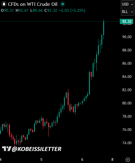 This is truly incredible to watch: 5 minutes ago, US crude oil prices surged above $91.50/barrel. Now, we are above $92.50, adding +$1/barrel in 5 minutes. This puts prices up +$12/barrel in 9 hours. We are witnessing a historic short squeeze as we speak.