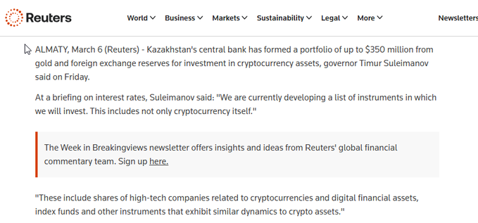 🚨Kazakhstan central bank to invest up to $350M in digital assets; likely to include Bitcoin