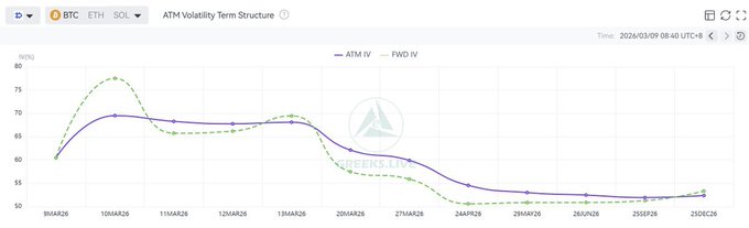 This Wednesday brings the U.S. February CPI data, Thursday features unemployment figures, and Friday releases the January PCE price index—three crucial macroeconomic indicators. However, in terms of actual market impact, the real macro event driving markets is the disruption to global oil shipments caused by the U.S.-Israel military operation in the Strait of Hormuz. Since last week, implied volatility across major maturities has risen significantly. Currently, BTC's short-term IV has surpassed 65%, while ETH's short-term IV has climbed above 80%—both reaching recent peaks. Market expectations for volatility this month continue to rise. Skew has been declining noticeably in recent days, indicating sustained growth in demand for downside protection.