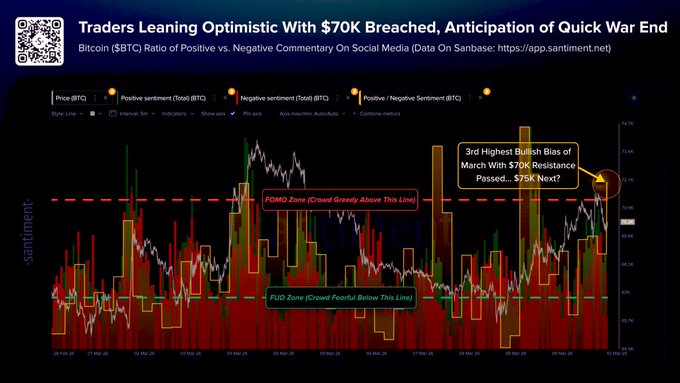 GM legends Bitcoin sentiment turns bullish as BTC climbs above $70K, FOMO returns.