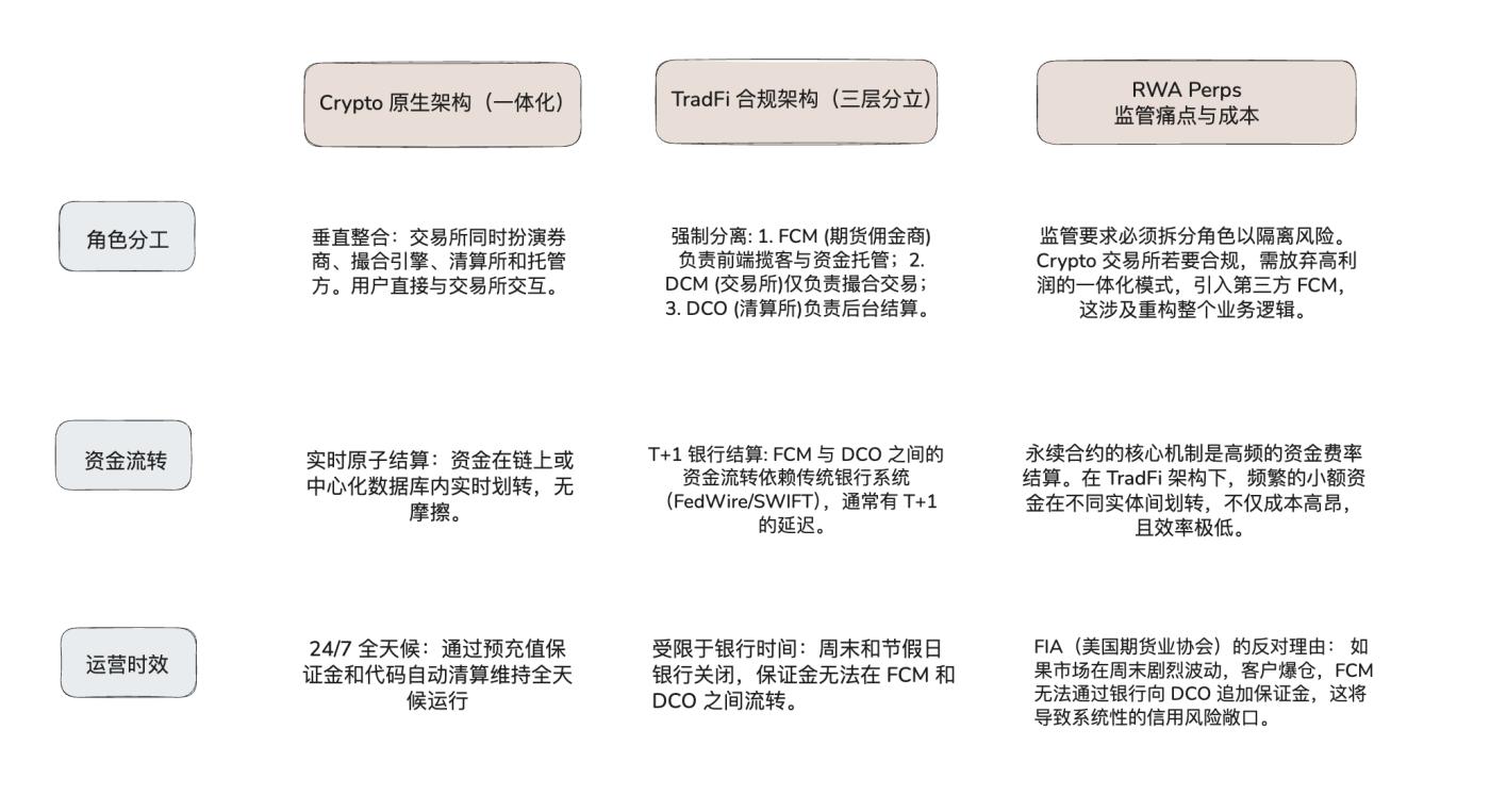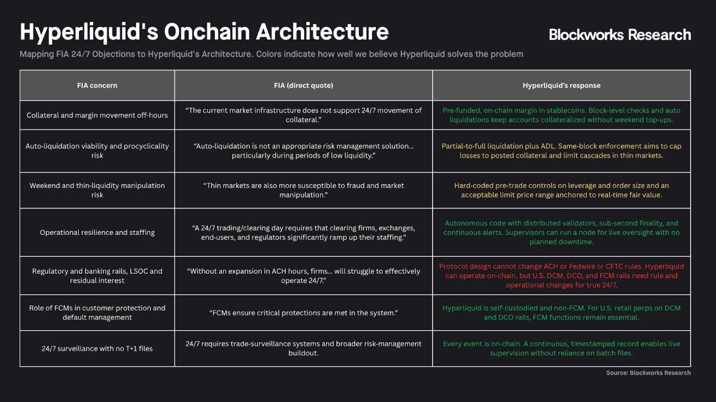 The chart above summarizes Hyperliquid's response to the CFTC's concerns about perpetual contracts and 24/7 trading , highlighting its ambition to become "a more open, transparent, and efficient financial system ." For example, it demonstrates how blockchain technology can directly overcome the physical time differences and efficiency bottlenecks of traditional finance by replacing the traditional DCO's reliance on the banking system with a 24/7 automatic clearing protocol, eliminating cumbersome FCM intermediaries with non-custodial technology, and reconstructing the regulatory logic of DCM using real-time on-chain data.