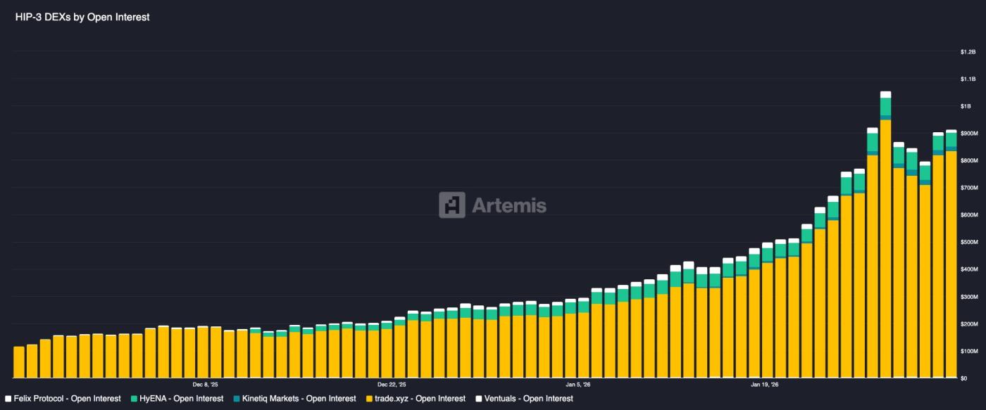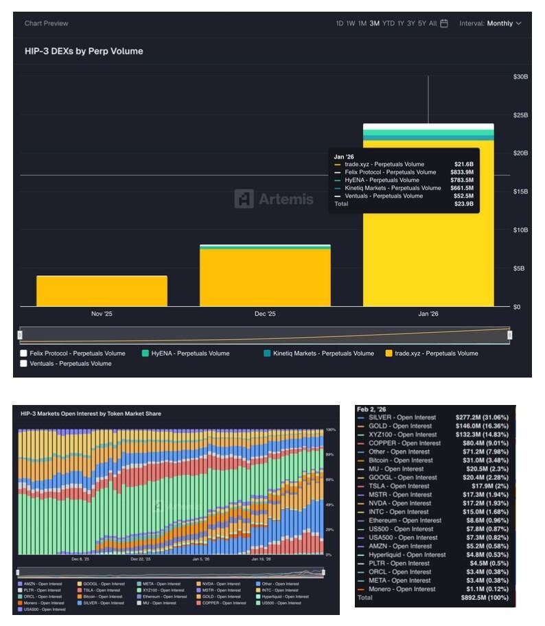 - Trade.xyz, built by HyperUnit, the asset layer team officially partnered with Hyperliquid, was the first to launch the XYZ100 perpetual contract tracking the Nasdaq 100 index, as well as several leading US tech stocks. With its rich asset bridging capabilities (supporting cross-chain liquidity injection for mainstream assets such as BTC, ETH, and SOL through HyperUnit), Trade.xyz currently leads all HIP-3 perpetual exchanges in trading volume, contributing approximately 90% of the market's trading volume.