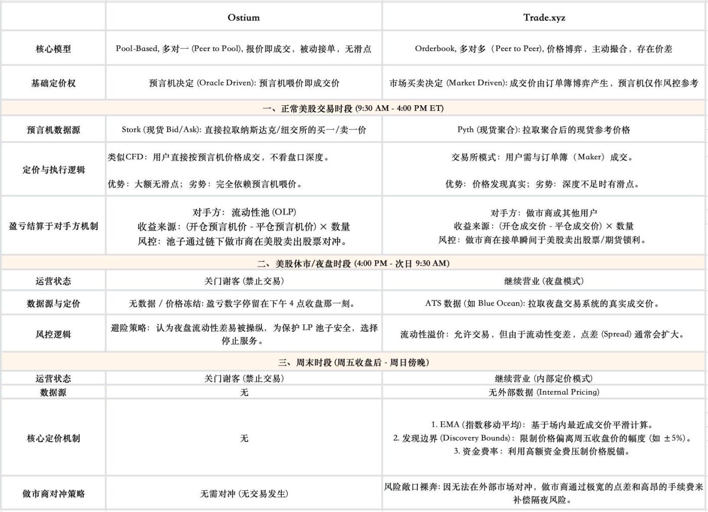 - Architectural Trade-offs in Asynchronous Markets. Connecting 24/7 crypto infrastructure to traditional markets constrained by physical trading hours forces protocols to compromise between high leverage, continuous trading, and externalized risk. To address traditional market closures, two distinct models have evolved: Ostium's proactive hedging liquidity pools prioritize solvency, eliminating gap risk entirely by suspending trading during market closures; while Trade.xyz (based on Hyperliquid) maintains 24/7 uninterrupted trading by translating weekend volatility risk into dynamic funding rates and market maker spreads.