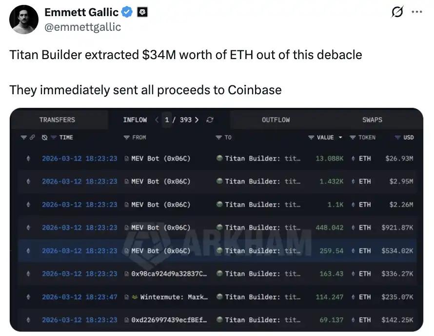 The biggest beneficiary was Ethereum block builder Titan Builder, who received approximately $34 million. On-chain analyst @emmettgallic discovered that Titan extracted this massive amount of ETH from the block containing the transaction and immediately transferred all proceeds to Coinbase after the block was confirmed.