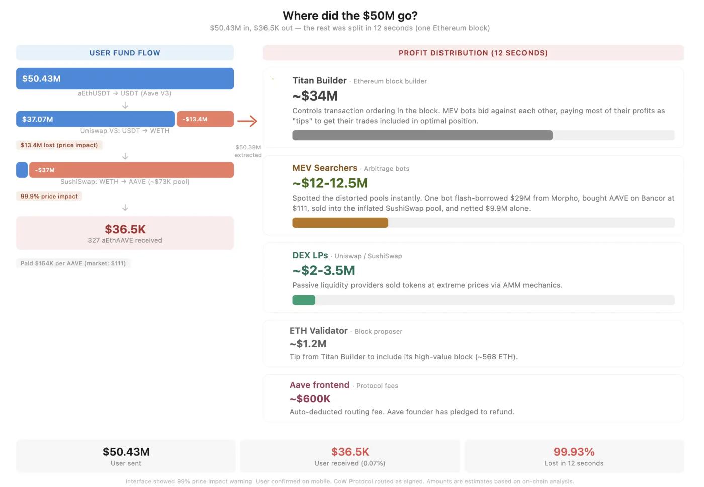 The entire transaction can be summarized as a three-stage evaporation. The first hop involved redemption through Aave V3, where 50.43 million aEthUSDT became 50.43 million USDT, resulting in no loss. The second hop involved Uniswap V3, where the 50.43 million USDT became 17,958 WETH (worth approximately $37.07 million), a loss of approximately $13.36 million. The third hop involved SushiSwap, where the 17,958 WETH became 331 AAVE (worth approximately $36,700), a loss of approximately $37.03 million. The total loss was $50.39 million. The user ultimately retained $36,100, representing 0.07% of the initial capital.