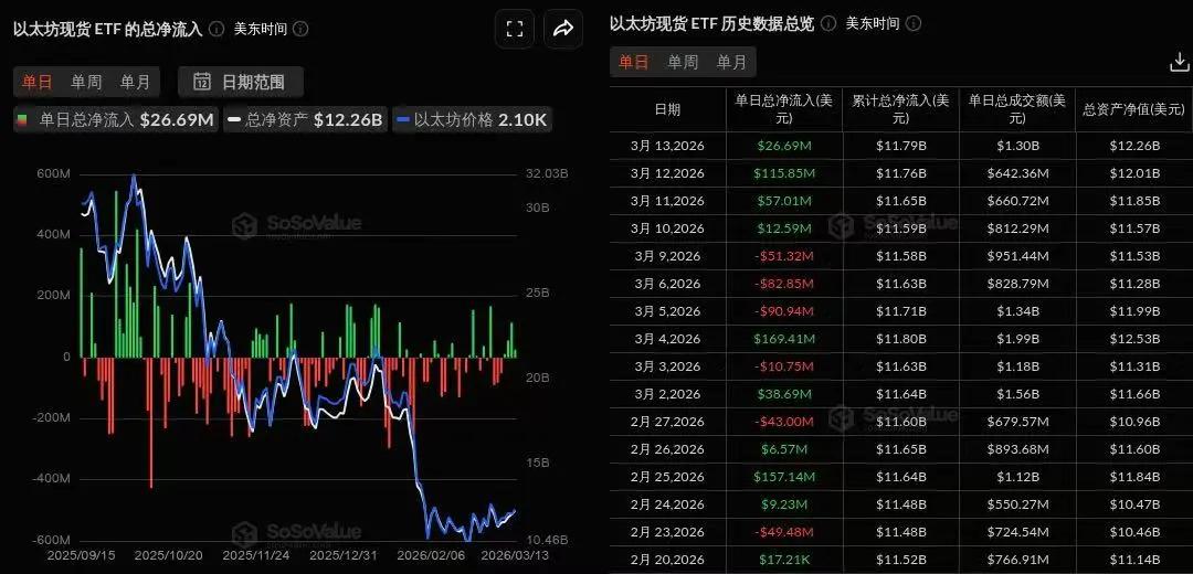 According to ChainCatcher, data from SoSoValue shows that yesterday (March 13th, Eastern Time), the Ethereum spot ETF saw a total net inflow of $26.6926 million.