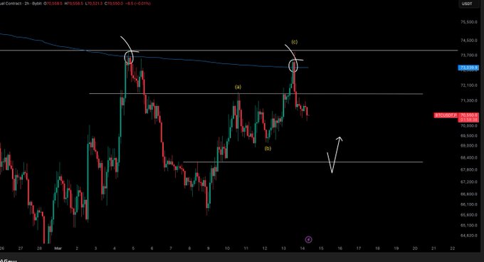 Good rejection from the AVWAP followed by an ABC rejection. I would argue this weekend we see more downside. Liquidity sits below us, and i would argue below $71,400 this downside would accelerate.