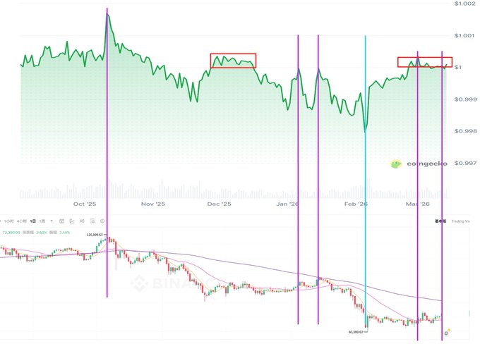 Besides the RSI, USDT price fluctuations also exhibit some patterns. USDT traded at a discount for an extended period after approximately November of last year. Only from November 28th to December 16th did the USDT price consistently remain above $1. The price briefly approached $1 on January 6th and January 15th. It reached a peak of 1.0004 on February 25th, and then fluctuated around $1. These USDT price peaks generally corresponded to BTC price peaks. Of course, USDT price peaks might occur earlier, as funds need to enter the market first before flowing into BTC.