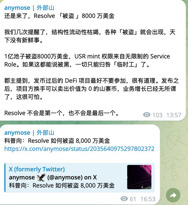 The first rule for survival in a crypto bear market is always to manage your finances carefully, minimize losses, and stay alive. Today's Resolv incident serves as another wake-up call for everyone. In today's fast-paced crypto cycle, the Pareto principle (80/20 rule) has distorted the true profit/loss ratio to 1% / 99%. Anything that 80% of people can do and are doing is destined to only make money for less than 1%. In this market, heed the advice of Han Xin: "Don't dream of the impossible." Following this logic, there are two things you should no longer do: 👉 Beware of high-interest traps with no barriers to entry. Saving money obviously has no barriers to entry. In the current liquidity environment, let alone a 10% annualized return, any investment project promising returns above 5%, unless backed by a top-tier CEX like Binance or OKX (specifically referring to in-site investments within the main platform, investments without significant disclaimers), should be treated with caution. You're after the interest, he's after the principal. 👉 Mindless profiteering is no longer a path to wealth. The core of profiteering still comes from secondary market liquidity. Clearly, there's no money left in the secondary market right now, so purely interactive profiteering is a classic example of a "simple but incorrect" decision. Mechanically sending real money to project teams every day is no different from throwing money into a wishing well and expecting a response. We incur extremely high certainty costs, yet can only passively wait for the project team's "merciful" handouts. Points are never the goal; making money is the goal. What we should do is "make money, and profiteering incidentally," not "profiteering incidentally, and praying to make money incidentally." For example, participating in prediction markets, relying on algorithms, logic, information asymmetry, and cognition to gamble for profit. This is indeed a "difficult but correct" thing to do (after all, very few people can consistently profit from prediction markets). For example, many group members have achieved great results by delving into other markets, such as US stocks and futures, where there are bigger pools and more fish.