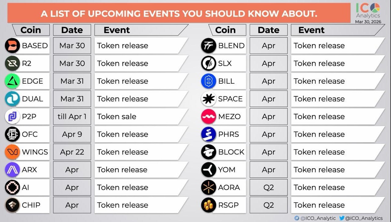 💎 Major Token Release Schedule for This Week ~ April ✅ This Week (Mar 30 ~ Mar 31) - BASED — TGE today / Total failure 🔪 - R2 — Mar 30 / Token Release - EDGE — Mar 31 / Token Release - DUAL — Mar 31 / Token Release - P2P — ~Apr 1 / Token Sale ✅ April Schedule Confirmed - OFC — Apr 9 / Token Release - WINGS — Apr 22 / Token Release ✅ Sometime in April (Date TBD) - ARX · AI · CHIP · BLEND · SLX - BILL · SPACE · MEZO · PHRS(Pharos) · BLOCK · YOM ✅ Scheduled for Q2 - AORA · RSGP 💬 Comment This week is a succession week with BASED, R2, EDGE, and DUAL coming out one after another. There is also quite a bit of supply accumulated for April. — It is particularly worth noting as PHRS (Pharos) is scheduled to unlock in April, especially if it coincides with the mainnet timing. Checking supply pressure before and after the token release is essential. Source: @ICO_Analytics #TGE #TokenUnlock