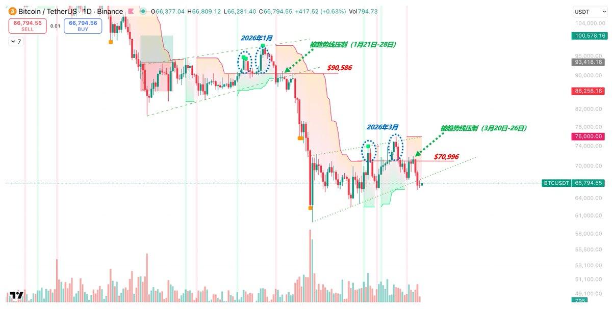 For example, between January 21st and 28th, BTC consistently failed to break through $90,586 (the red trend line) and ultimately chose to continue its downward trend. Similarly, between March 20th and 26th, it again failed to hold above $70,996 before falling to $65,548.