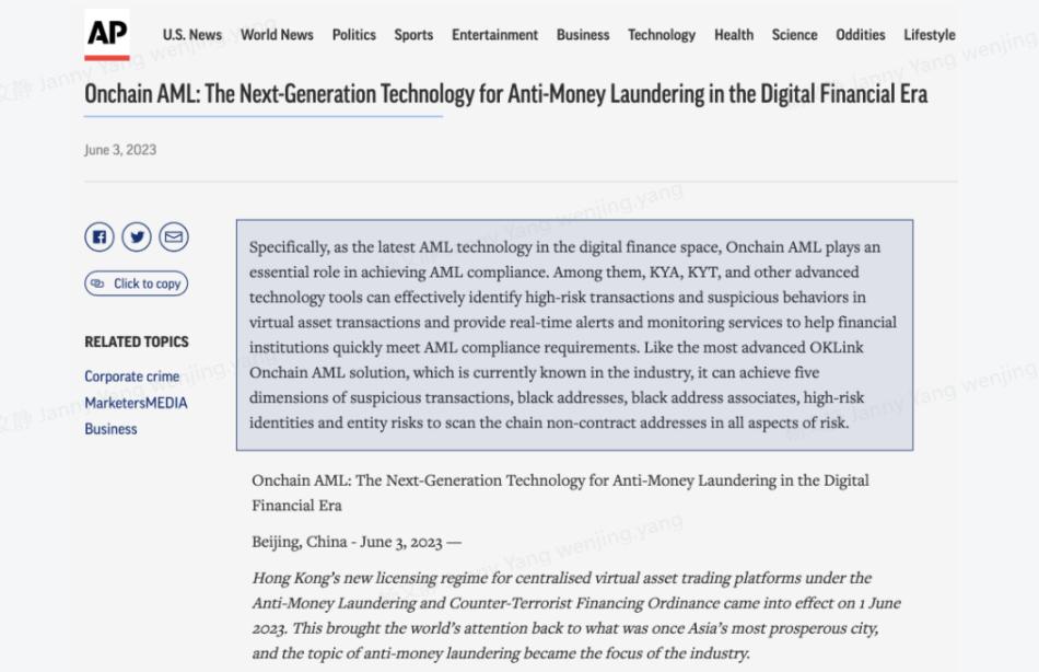 In the report of the Associated Press, the historical background and technological development process of anti-money laundering (AML) were elaborated in detail, and it was pointed out that Onchain AML will become a key factor for financial institutions and service providers to enter the field of virtual asset compliance. OKLink’s latest The launched on-chain anti-money laundering (Onchain AML) solution has also become a hot topic in the market.