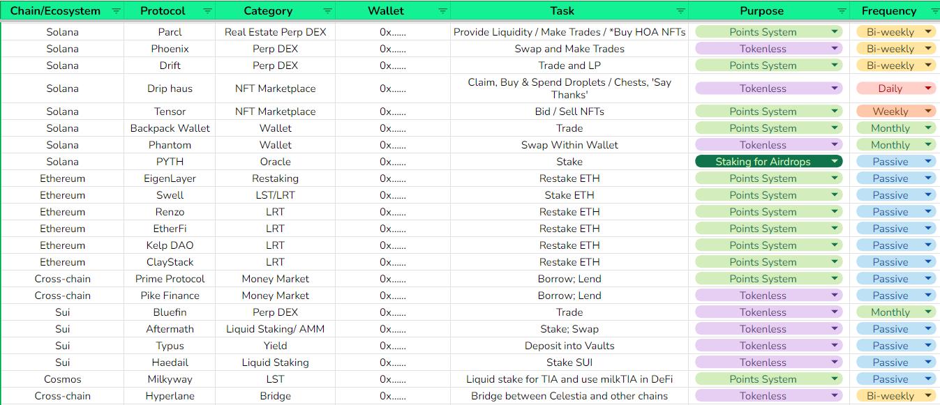 To keep track of this my team and I put this framework into an airdrop tracker. This tracker has over 50 potential airdrops populated already and can be easily expanded to include more.