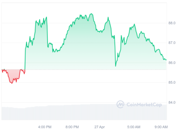 As of today, LTC is priced at $86.14, with a trading volume of $582,053,315.43 in the past 24 hours. The token has a small intraday increase of 0.65% and a sharp increase of 4.45% in the past week. Its circulation is 74 million LTC and its market value is $6,412,332,719.