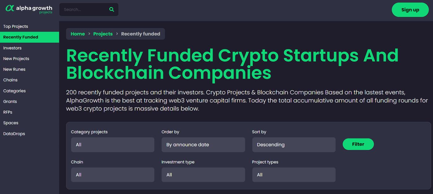 Looking at recent fundraising announcements can be a great way to discover new crypto projects. AlphaGrowth tracks recently funded blockchain companies. To assist with finding relevant projects, these companies can be filtered by: