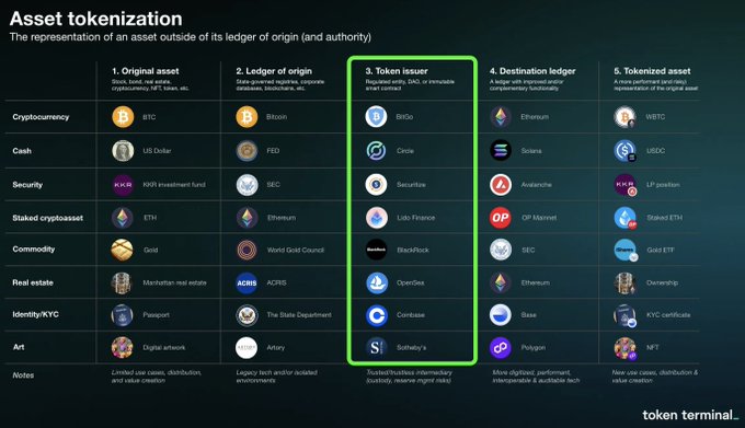 One framework for thinking about asset tokenization Token issuers take original assets & give them superpowers: 🌐 global liquidity & accessibility 🧊 24/7 auditability 🔁 orders of magnitude better interoperability ... and more! Token issuers = investment targets (💰,📈)
