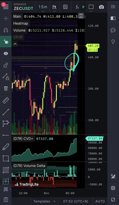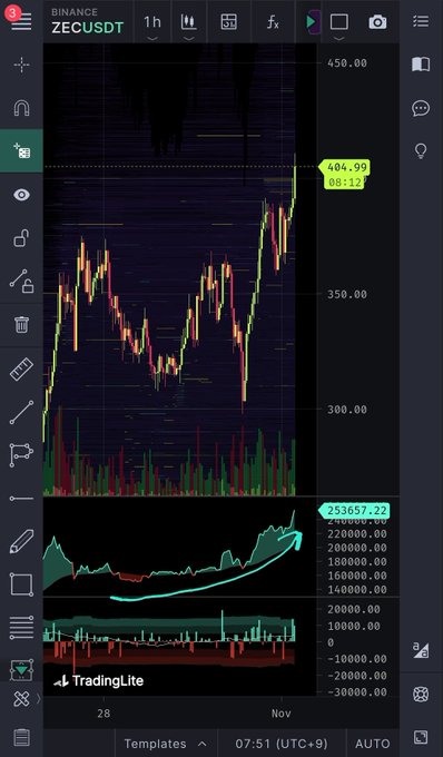 360후 300까지 가격 조정이 왔으나.. 특히 어제부터 급격히 들어온 매수세는 $zec를 다시 360 가격 구간을 상방으로 돌파시킴. 최근에 가격이 몇배가 올랐어도.. 지난 수년간 가격 최상단 구간임에도.. 여전히 큰 매수세가 발생(손바뀜)했다는 것에 의미가 있음. twitter.com/gorochi0315/status...