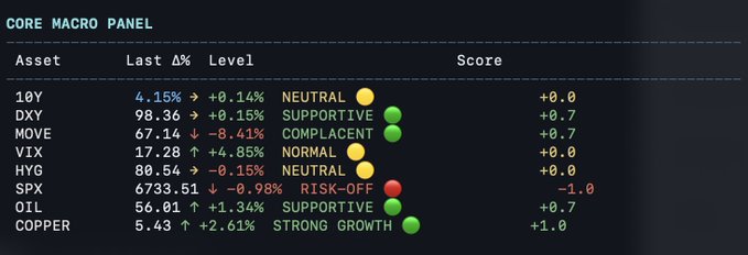 거시 경제 환경은 전반적으로 중립적입니다. DXY는 MOVE가 소폭 상승했음에도 불구하고 위험 선호 심리를 뒷받침하고 있으며, 2년물-10년물 금리 곡선은 안정적인 실질 수익률을 유지하고 있습니다.