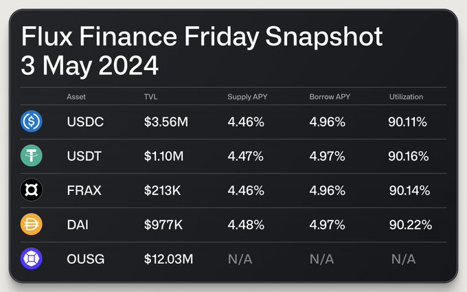 이번 주의 플럭스(Flux) Finance 금요일 스냅샷 살펴보세요! 📸 Stablecoin 대출 기관은 현재 @OndoFoundation에서 Ondo 포인트를 얻고 있으며 $OUSG에서 담보로 최대 4.48% 연간 수익률 의 수익률을 받고 있습니다. @OndoFinance에서.