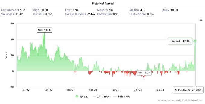 ETH-BTC 거래량 스프레드(1주 ATM)가 연초 누계(YTD) 최고치를 기록했습니다. '22년 11월 FTX 주간보다 높습니다. 2022년 9월 병합 과대 광고 기간 이후 최고치입니다. 참고 차트는 @laevitas1의 🐐Spread 분석 도구에서 가져온 것입니다.