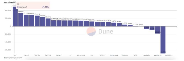2024년에는 탈중앙화 인공 지능이 암호화폐 시장에서 가장 역동적이고 빠르게 성장하는 영역 중 하나가 되었습니다. CryptoKoryo가 만든 Dune 대시보드에 따르면 인공지능은 암호화폐 산업에 대한 관심과 투자 측면에서 선도적인 영역으로 두각을 나타내고 있습니다.