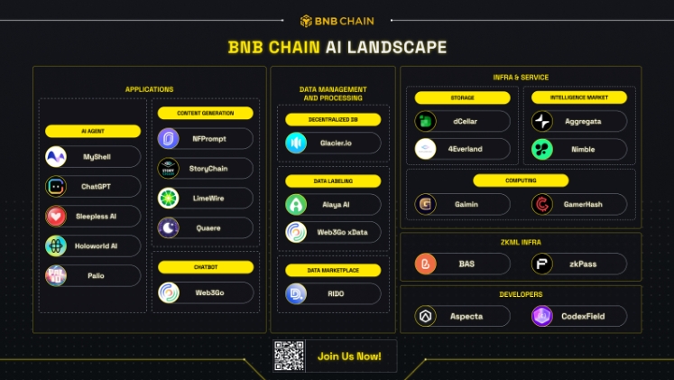 BNB 체인은 BNB 스마트 체인(BSC), opBNB 및 BNB Greenfield를 포함한 강력한 인프라와 멀티체인 아키텍처를 통해 탈중앙화 인공 지능을 위한 플랫폼을 제공합니다. BSC는 EVM 호환성, 지분 증명 합의 모델, 낮은 거래 비용으로 초당 최대 5,000건의 거래를 처리할 수 있는 기능을 제공합니다. 인프라는 AI 애플리케이션에 중요한 대용량 및 고속 트랜잭션을 지원하는 동시에 이더 기반 DApp과의 호환성을 통해 배포를 가속화합니다. 빠른 블록 최종성과 병렬 EVM의 잠재력은 트랜잭션 실행을 더욱 향상시킵니다.