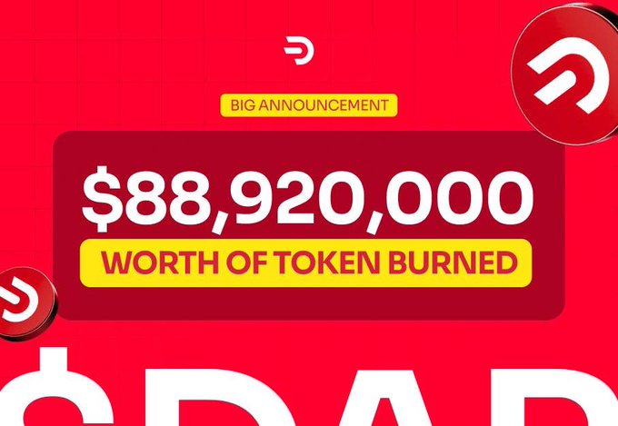 오늘 우리는 $DAR의 50%를 소각하여 우리 여정의 중요한 순간을 맞이하려고 합니다. 총공급! 이 토큰은 현재 시장 가치로 $88,920,000를 나타냅니다. 이 이벤트는 토큰 이코노미 의 미래를 위한 강력한 기반을 마련할 것입니다 🚀 BURNS를 시작해 보세요 🔥