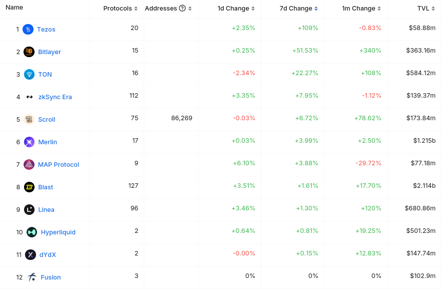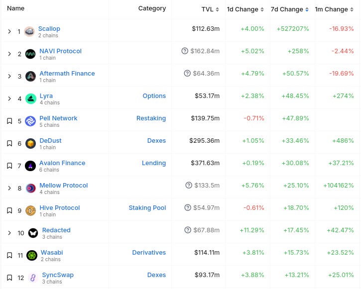 다음은 주간 Total Value Locked(TVL) 기준 최소 5천만 달러의 Total Value Locked(TVL) 로 가장 빠르게 성장하는 상위 12개 체인입니다 ( 디파이라마(defillama) 에서) :