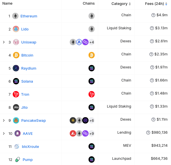 24시간 수수료 생성 기준 상위 12개 기관은 다음과 같습니다 (디파이라마(defillama) 에서) .