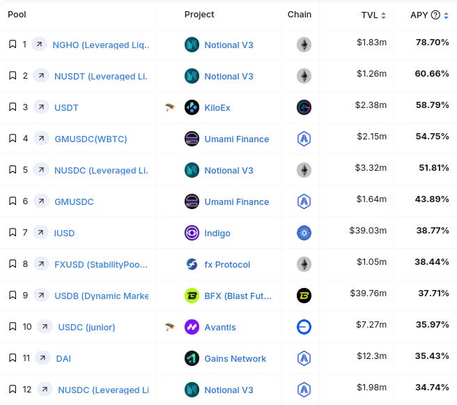(참고: 디파이라마(defillama) 에서 가져온 최고 스테이블코인 수익률입니다($1M+ Total Value Locked(TVL), 단일 노출, IL 없음만 해당). - 참고: 이 목록은 원시 데이터일 뿐이므로 모든 프로토콜과 상호 작용하기 전에 항상 DYOR을 수행해야 합니다. )