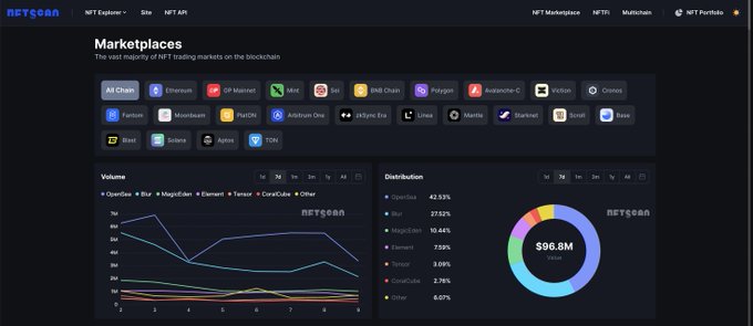 📊 NFTScan 멀티체인 데이터의 최신 통찰력: 지난 7일 동안 @opensea는 거래량 4,117만 달러로 1위를 차지하며 시장 점유율 42.53%를 차지했습니다. @blur_io가 2,663만 달러(27.52%)로 그 뒤를 바짝 추격하며 강력한 입지를 유지하고 있습니다. @MagicEden은