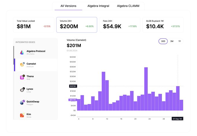 @아비트럼(Arbitrum)의 @CamelotDEX V3에서 Total Value Locked(TVL)과 거래량 비율이 믿을 수 없을 정도로 좋습니다! 이 모든 것은 우리의 탈중앙화 거래소(DEX) 엔진으로 가능했습니다. 그들에게 정말 좋은 일이네요! (그리고 우리에게도 확실히 그렇습니다 🤭) Algebra 웹사이트에서 그들의 통계를 확인해보세요: http:/algebra.finance