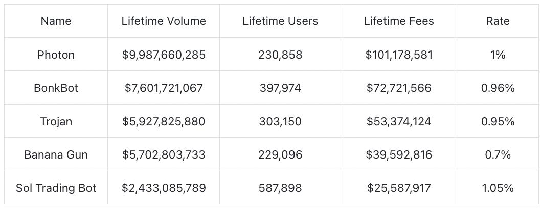 표에서 우리는 Dex Trading Bot 트랙의 상위 5개 프로젝트가 Photon, BonkBot, Trojan, Banana Gun 및 Sol Trading Bot임을 알 수 있습니다. 전체 거래량 측면에서 보면 바나나건이 4위임에도 불구하고 3위인 트로이목마와는 누적 거래량에서 아주 작은 차이가 있지만 5위인 솔트레이딩봇과는 격차가 있으므로, 이를 첫 번째 단계에 소개합니다: Photon, BonkBot, Trojan 및 Banana Gun.