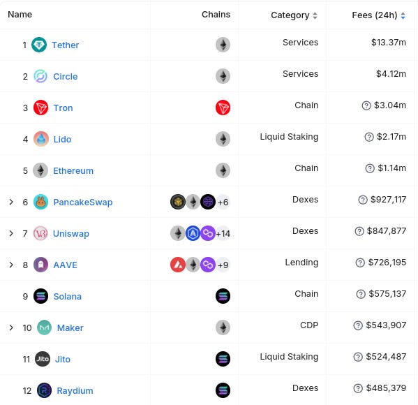 24시간 수수료 생성 기준 상위 12개 엔터티는 다음과 같습니다 (출처: @ 디파이라마(defillama)) :
