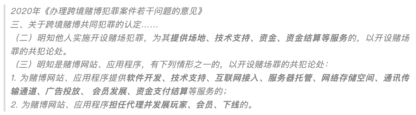 에이전트의 역할은 더 많은 도박꾼을 웹사이트에 모집하여 더 많은 사람들이 도박 웹사이트에 베팅을 증가시켜 에이전트 자체가 상당한 수수료와 서비스 수수료 수익을 얻을 수 있도록 하는 것입니다. 그의 행동과 위에서 언급한 도박 웹 사이트 스튜디오 직원이 수행하는 활동은 모두 "다른 사람들이 온라인 카지노를 개설하고 있음을 알면서 도움을 제공하는 것"입니다. 다음 규정을 보면 도박사이트에 플레이어, 회원, 오프라인 개발, 기술지원, 자금정산, 광고 등을 제공하는 행위 등을 모두 카지노 개설 범죄의 공범으로 간주함을 알 수 있다.