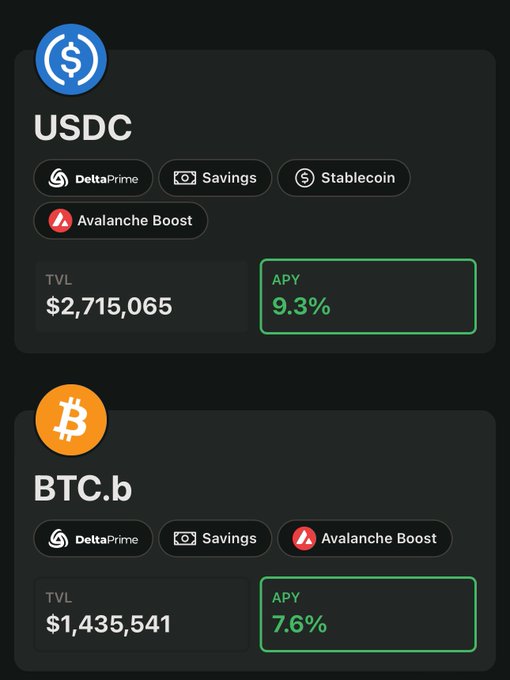 수익 야크의 두 가장 빠르게 성장하는 풀은 아발란체(AVAX) 부스트와 델타 프라임 디파이 덕분입니다. USDC 9% 비트코인(BTC).b 8% 부스트된 풀을 필터링하려면 다음 링크를 참조하세요: yieldyak.com/avalanche/yield/?...…