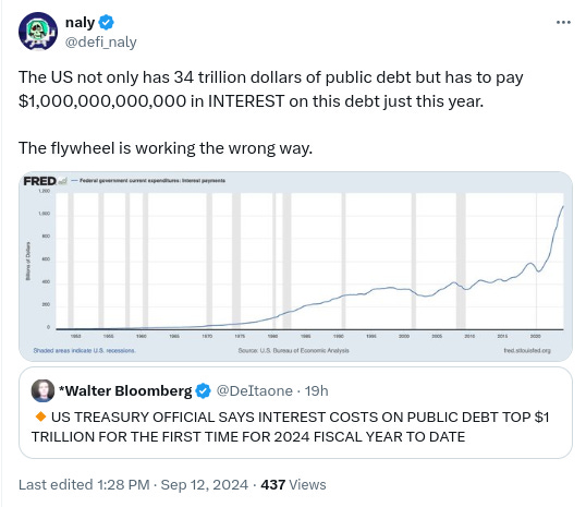 - 올해 미국 국가채무에 대한 이자 비용이 사상 처음으로 1달러를 넘어섰습니다. h/t @defi_naly: