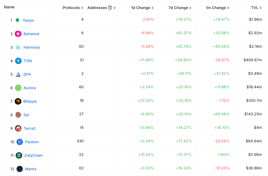 체인은 오늘날 매우 녹색입니다. 세 가지 타임라인(일일, 주간, 월간) 모두에서 빨간색으로 표시된 상위 50개 체인은 Mixin(#37)과 zkSync Era(#45)뿐입니다.