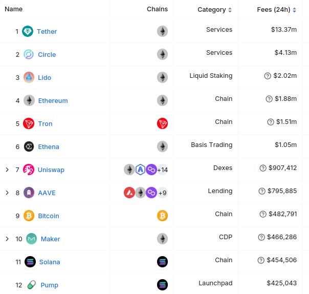 24시간 수익 기준 상위 12개 기업은 다음과 같습니다 (출처: @ 디파이라마(defillama)) :