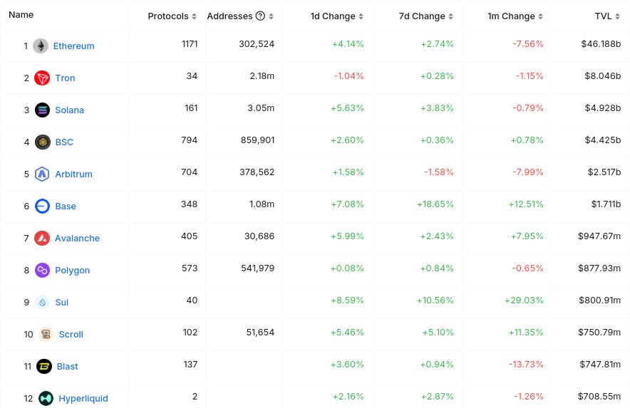 체인은 오늘 꽤 녹색입니다. 주간에서 최소 15% 상승한 상위 25개 체인에는 Base(#6), Core(#21), Pulsechain(#24)이 포함됩니다.