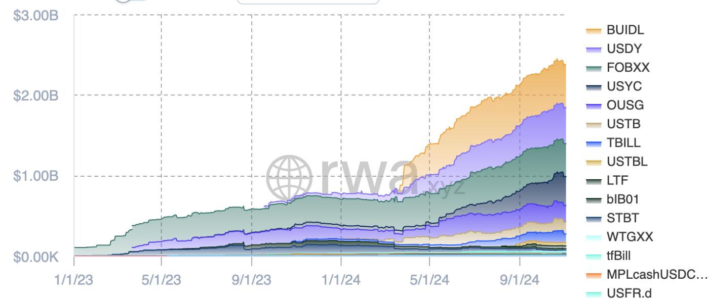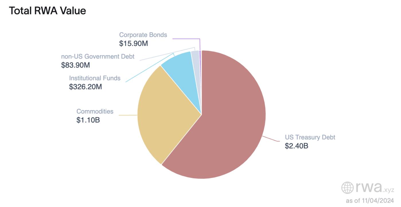 참고로, RWA.xyz 데이터에 따르면 총 실물 자산 가치의 약 24억 달러가 미국 국채 부채이며, 상품이 11억 달러로 두 번째로 큰 비중을 차지하고 있습니다. 아래 차트에는 서클과 테더와 같은 스테이블코인 발행사가 보유한 국채는 포함되어 있지 않습니다.