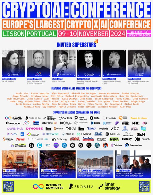이번 주말 @lunarstrategy가 리스본에서 Crypto AI:CONFERENCE를 개최합니다! 🇵🇹 - 50명 이상의 연사 - 80명 이상의 파트너 - 2일 리스본에 계시다면 DM을 보내주세요. 공유할 할인 혜택이 있습니다! #CryptoAI #LisbonConference #FutureTech