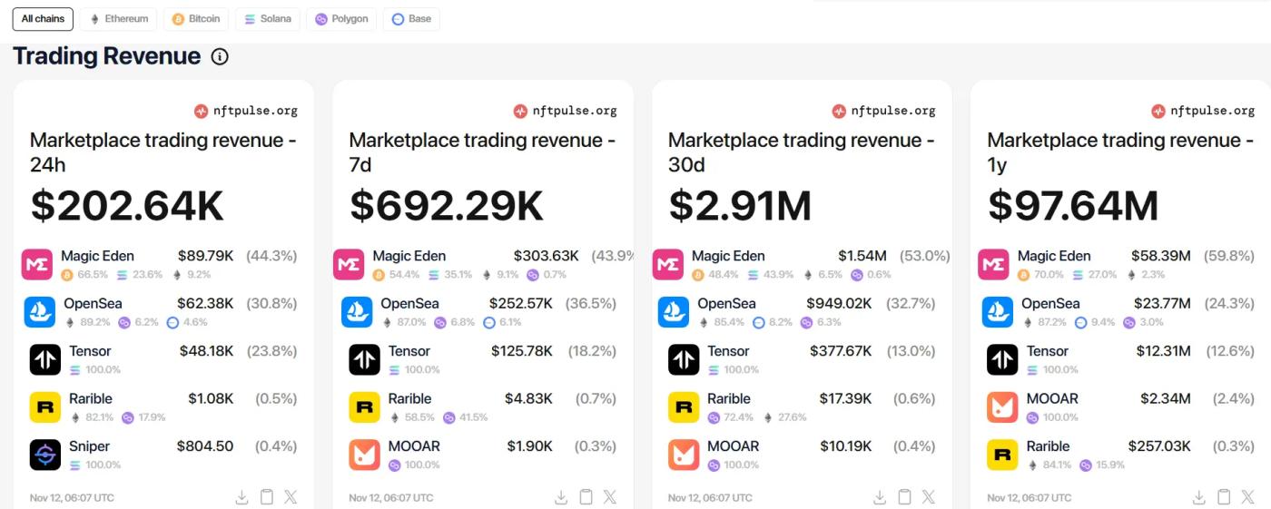 NFTPulse 데이터에 따르면, 지난 1년 동안 매직 에덴 플랫폼의 거래 수수료 수익은 5,839만 달러에 달하며, 전체 NFT 시장 수익의 약 60%를 차지하며 가장 높은 수익을 올리고 있습니다.