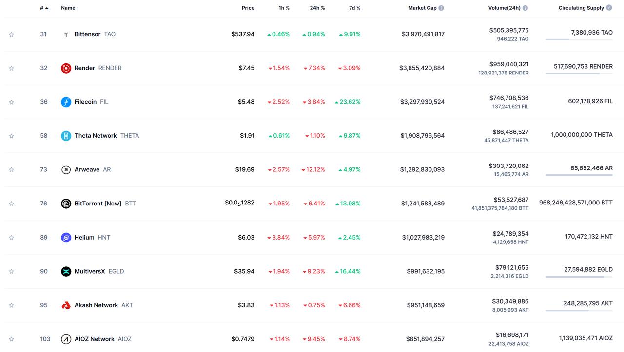 그러나 인터넷과 사물 인터넷의 지속적인 발전으로 인해 DePIN의 프로젝트는 주로 해시레이트, 데이터 수집 및 공유, 무선, 센서, 에너지 등으로 확장되었으며 인프라 요구 사항과 혁신 요구 사항이 점점 더 많아지고 있습니다. 현재 DePIN 분야의 시총 상위 10개 프로젝트를 보면 대부분이 스토리지 및 해시레이트 분야에 속합니다.