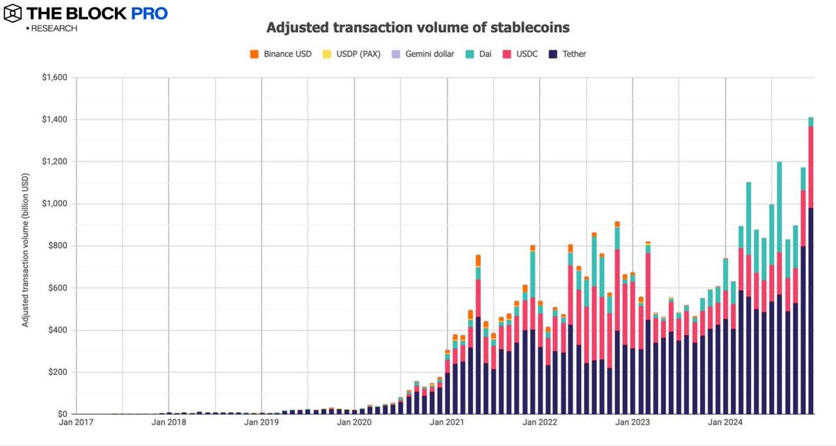2/12 스테이블코인의 조정된 거래량 거래량 20.3% 증가하여 새로운 신고가 인 $1.41T에 도달했습니다. 발행 공급량은 1.7% 증가하여 새로운 신고가 인 $170B에 도달했으며, 테더 USDT(USDT) 각각 79.2%, USDC는 18.3%의 시장 점유율을 기록했습니다.