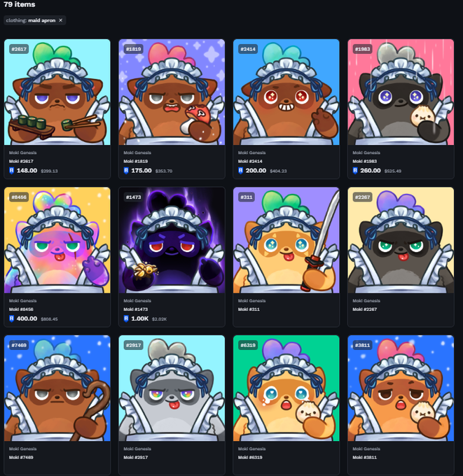 8888 명의 모키 중 79 명이 모키 메이드이며, 그 중 5 명만이 148 알위브(AR) 바닥 가격에 판매 중입니다. 메이드 갱은 매우 희귀합니다. 우리는 청소합니다. 우리는 더러운 일을 합니다. 우리는 그것을 잘합니다. 우리는 비밀 메이드 요원입니다. 우리에게 연락하세요.