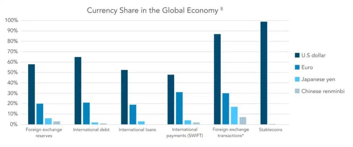 퍼블릭 블록체인은 명목 화폐를 강화하여 전 세계 50억 스마트폰 사용자의 손끝에 화폐를 제공하고 국경 간 이동을 쉽게 만듭니다. 스테이블코인으로 알려진 토큰화된 명목화폐에 대한 수요는 미국 달러가 시장을 지배하면서 2,000억 달러 규모의 산업을 창출했습니다. Castle Island와 Brevan Howard가 발표한 보고서에는 다른 경제 범주에 비해 미국 달러가 스테이블코인 담보를 거의 100% 지배하고 있음을 보여주는 차트가 포함되어 있습니다.