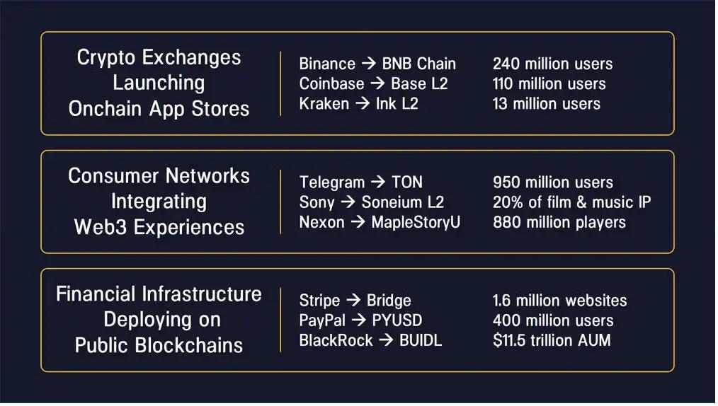 80억 명의 사용자에게 다가가는 방법은 무엇입니까? 2025년에는 수억 명의 소비자에게 대규모로 접근할 수 있는 새로운 유통 모델이 등장할 것입니다. Coinbase, Kraken 및 Binance와 같은 가상화폐 거래소 자체 구축된 블록체인을 통해 사용자를 온체인 연결하고 있습니다. Telegram과 Sony는 Web3 기능을 대규모 사용자 플랫폼에 통합했습니다. 게임 회사들은 MapleStory와 같은 클래식 게임에 온체인 기능을 추가하여 잠재적으로 수백만 명의 플레이어를 다시 끌어들이고 있습니다. PayPal 및 BlackRock과 같은 기관도 온체인 금융 및 결제 솔루션을 출시하고 있습니다.
