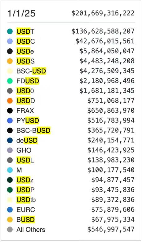 법정화폐 기반 스테이블코인 상위 20개 중 16개에는 이름에 "USD"가 포함되어 있습니다.