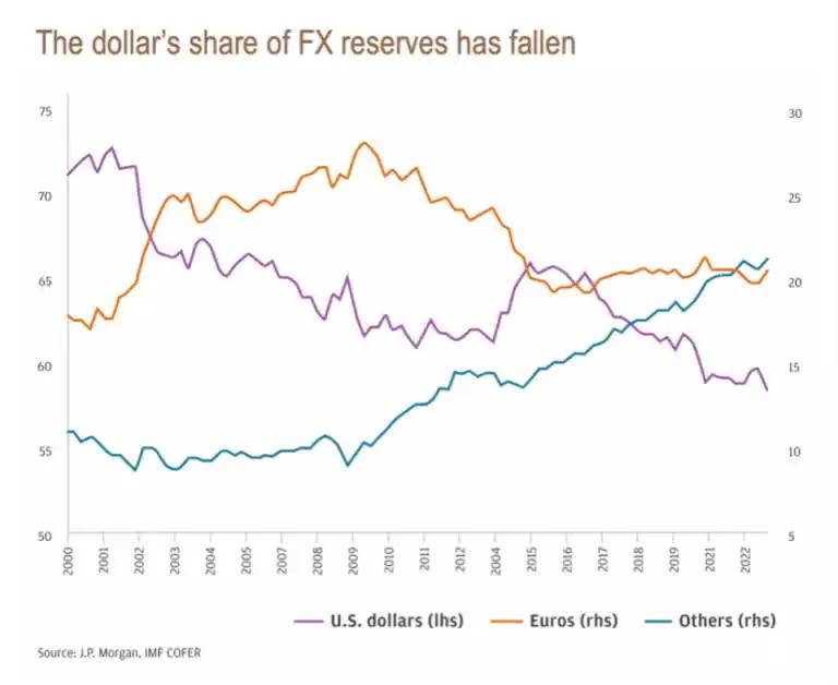세계 무역과 금융거래에서 국가와 기관이 달러의 지배력에서 점차 멀어지는 것을 뜻하는 탈달러화(de-dollarization) 추세가 커지면서 달러의 장기적인 지배력에 대한 우려가 커지고 있다. 달러 지배력을 측정하는 가장 일반적인 척도는 외환보유액 중 달러가 점유율 으로, 이는 2000년 이후 13%포인트 감소했습니다.